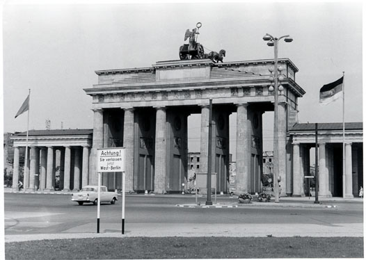 Abriegelung des Sowjetsektors durch Volksarmisten am Brandenburger Tor. Aufgenommen am 13.8.1961 Quelle: Landesbildstelle Berlin